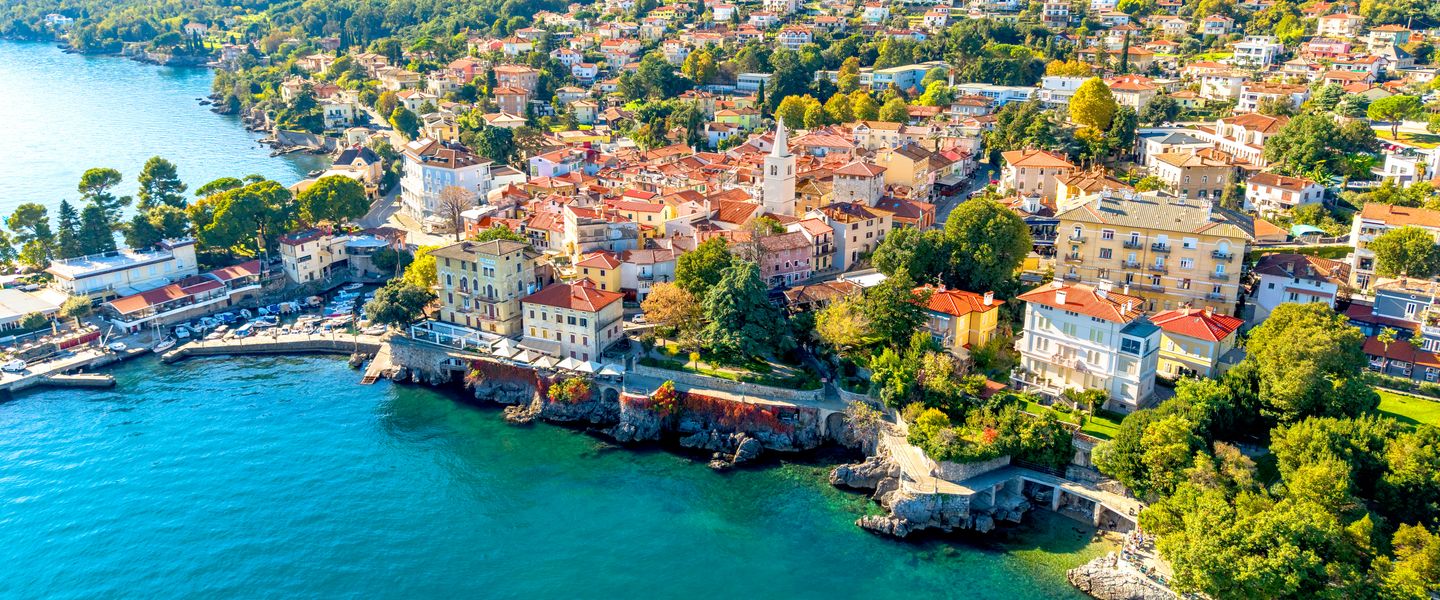 Opatija ist eine Stadt in Kroatien, die an der Kvarner Bucht in der Region Primorje-Gorski Kotar liegt. Sie ist bekannt für ihre elegante Architektur, die von der Zeit des Habsburgerreiches geprägt ist, und gilt als einer der ältesten und bekanntesten Kurorte an der Adriaküste. Opatija ist berühmt für ihre wunderschöne Uferpromenade, die Lungomare, die sich über mehrere Kilometer entlang der Küste erstreckt und atemberaubende Ausblicke auf das Meer bietet. Die Stadt hat eine reiche Geschichte, die im 19. Jahrhundert begann, als sie zu einem beliebten Ziel für wohlhabende Touristen und Aristokraten wurde, die die heilenden Eigenschaften des mediterranen Klimas und der Umgebung suchten.