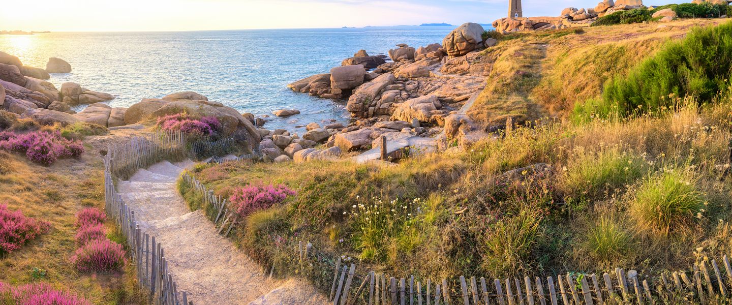 Die Rosa Granit Küste erstreckt sich entlang der Nordküste Frankreichs, insbesondere im Departement Côtes-d'Armor in der Bretagne, etwa 100 Kilometer nordwestlich von Rennes. Die bekanntesten Orte entlang dieser Küste sind Perros-Guirec, Trégastel und Ploumanac'h, die alle leicht mit dem Auto oder öffentlichen Verkehrsmitteln zu erreichen sind. Die Region ist von einer beeindruckenden Natur umgeben, die von sanften Hügeln, malerischen Stränden und dem klaren blauen Wasser des Atlantiks geprägt ist. Die Rosa Granit Küste ist ein ideales Ziel für einen erholsamen Urlaub oder einen Tagesausflug, um die Schönheit der normannischen und bretonischen Küstenlandschaft zu genießen.